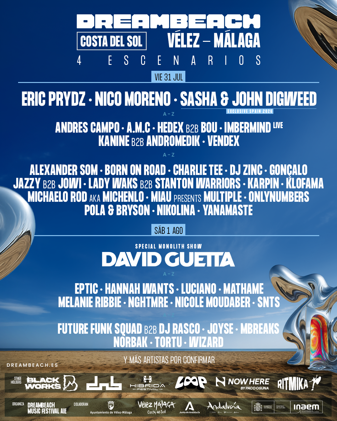 Con una propuesta que combina grandes headliners internacionales, exclusividades y talento emergente, Dreambeach Costa del Sol encara una nueva edición con el objetivo de ofrecer una experiencia musical de primer nivel en un entorno único. La última entrega del evento en 2025 reuníó a más de 90.000. La Organización está trabajando en el primer avance de programación que comenzará a dar forma a Dreambeach Costa del Sol. Una apuesta por actualizar la propuesta de Dreambeach, de la mano de una producción que podrá la comodidad de los dreamers como su principal objetivo, en un nuevo recinto con estructuras espectaculares, con cuatro escenarios independientes, por donde pasarán artistas nacionales e internacionales durante dos únicas jornadas, viernes 31 de julio y sábado 1 de agosto. Dreambeach está apoyado por el Ayuntamiento de Vélez-Málaga. Con el patrocinio del INAEM.